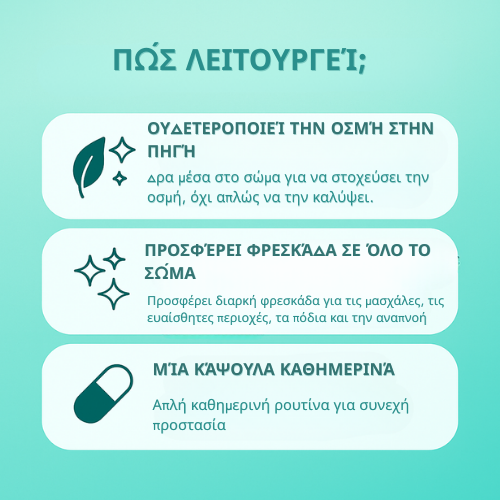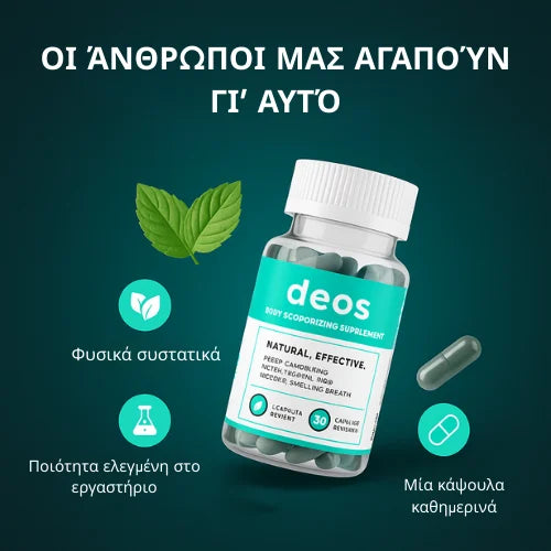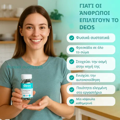 Με το Deos™ θα απολαύσετε πλήρη προστασία από τις οσμές του σώματος, βελτιωμένη υγεία του εντέρου και πιο καθαρό δέρμα, όλα με μία ημερήσια κάψουλα.